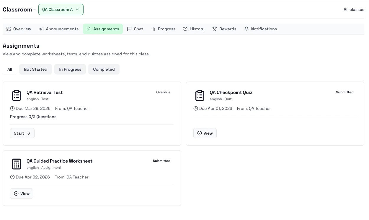 The Assignments tab is where you open class work from your teacher, check due dates, and continue anything you started earlier.
