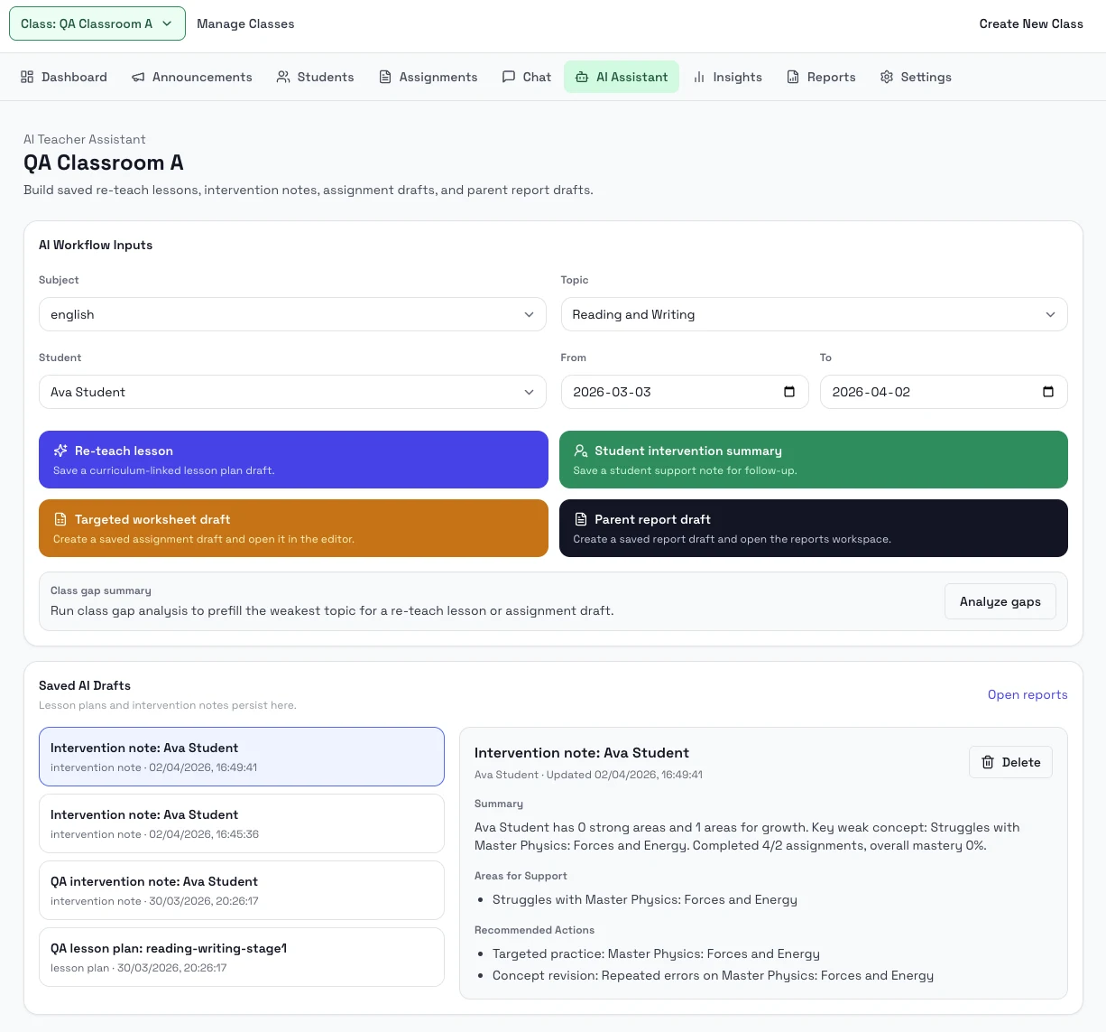 The classroom AI assistant helps you produce targeted teaching drafts from real class data.