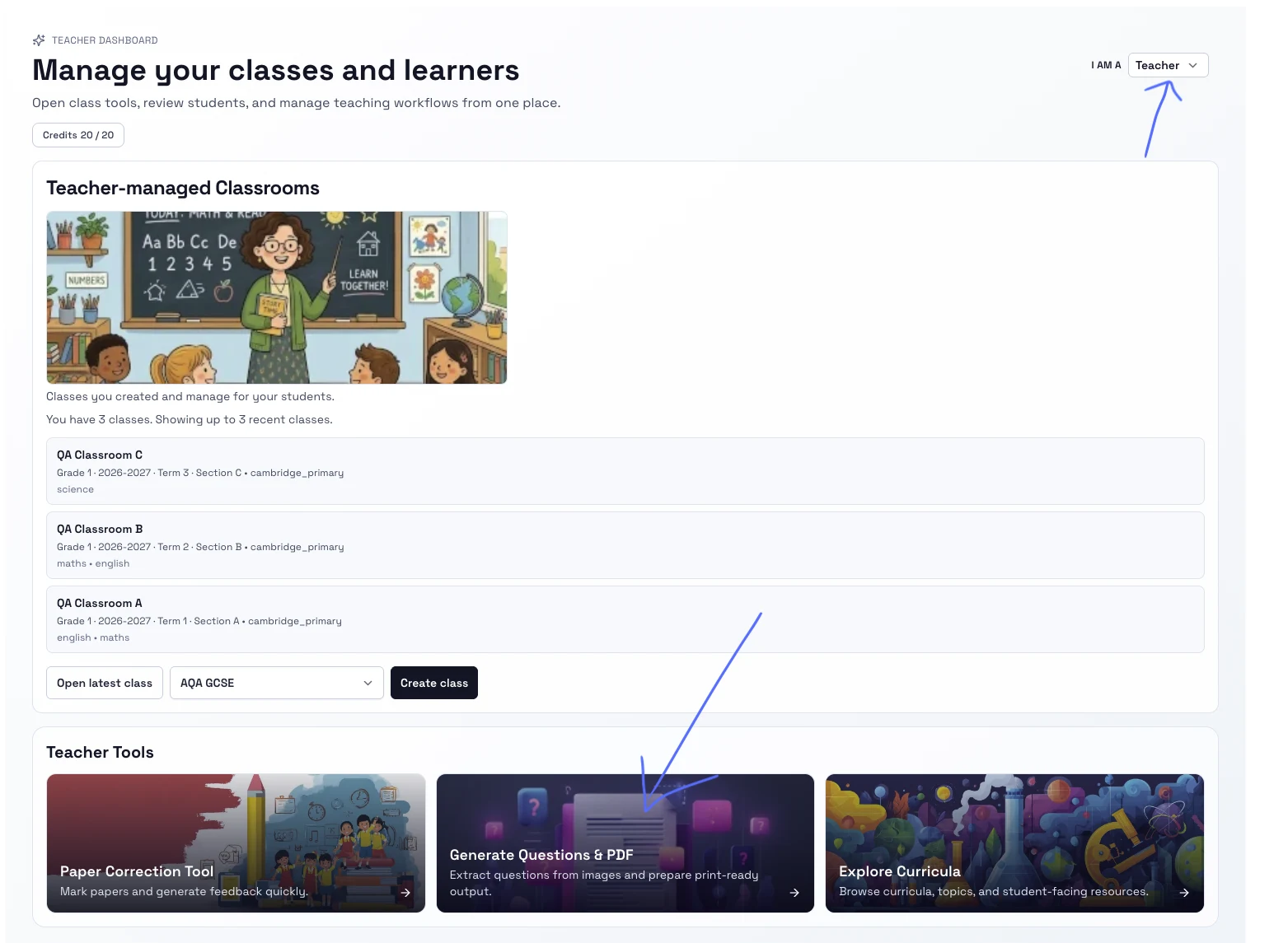 Use the question paper generator when you want to upload a source image, generate editable questions, and export a print-ready PDF.