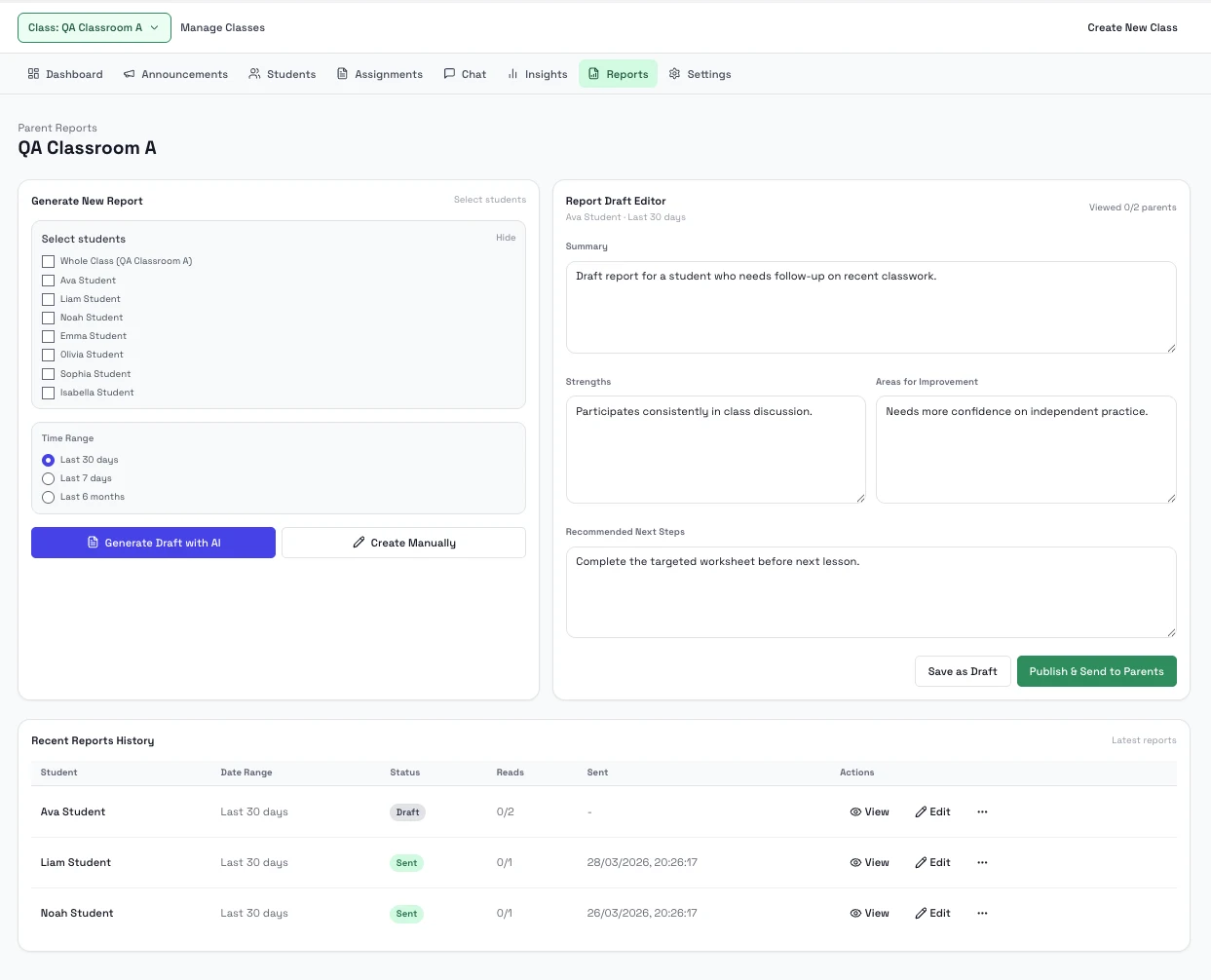 Use reports when you want a parent-facing summary or teacher note for selected students, and use class insights when you need broader classroom performance trends.