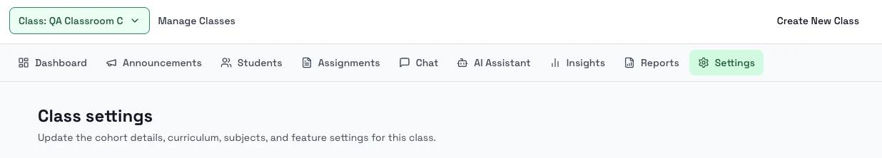 Class settings control how a class behaves, who can manage it, and how the curriculum is configured for the cohort.